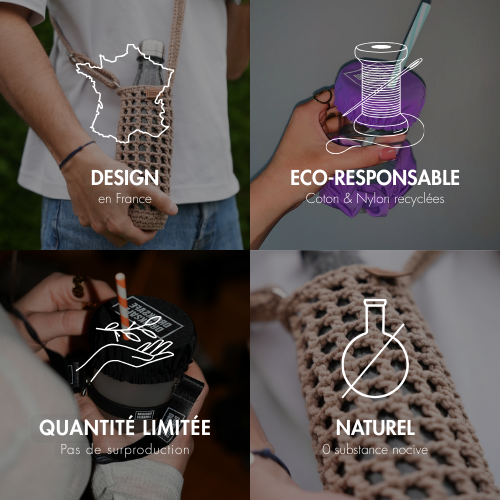 Nos produits signatures sont crochetés à la main et fabriqués en Turquie, en coton & Nylon 100% recyclé, dans des ateliers à taille humaine et à des prix justes.